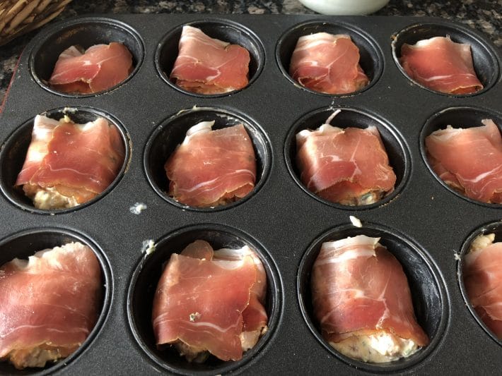 - 12 Tranchen Landrauchschinken in eine gefettete Muffinform legen – pro Ausbuchtung eine Lage